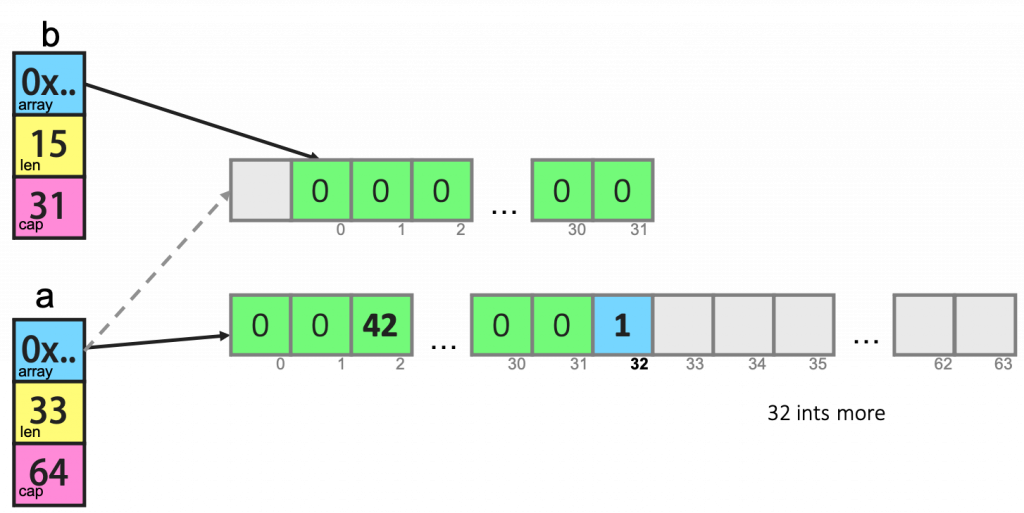 从上图我们可以看以看到 append()操作让 a 的容量变成了64,而长度是33。这里,需要重点注意一下——append()这个函数在 cap 不够用的时候就会重新分配内存以扩大容量,而如果够用的时候不不会重新分享内存!