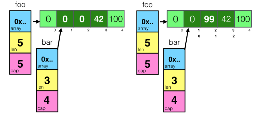 • 首先先创建一个foo的slice,其中的长度和容量都是5