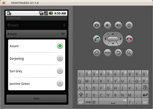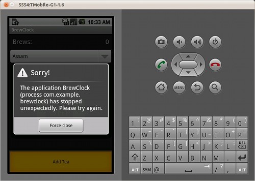 在模拟器中运行应用程序,定一个泡茶时间(这真是一个良好的借口去泡一杯你自己爱喝的茶哦)并退出应用程序,试着运行模拟器上的安装的其他应用程序确保BrewClock被终止。记住,除非这个应用程序已经不在内存中,否则Android不会终止一个Activity。