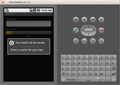 在模拟器中运行你的程序,按下“Menu”按键,点击屏幕上的“Add Tea”。试图通过在此按下“Menu”和点击屏幕的 “Save Tea.”来保存空茶叶名的茶叶数据。由于是没有茶叶名,一条错误消息将出现在你的面前: