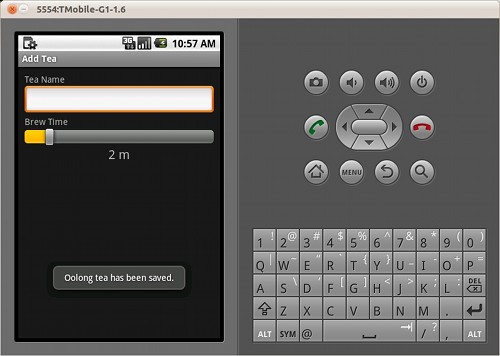 现在,重新运行应用程序,并增加和保存一些新茶叶。你将会看到弹出式的Toast并让你知道你的茶叶信息已经被保存成功。getString()方法用于连接存在XML文件中的String和茶叶名称,并将%s替换成茶叶的名称。