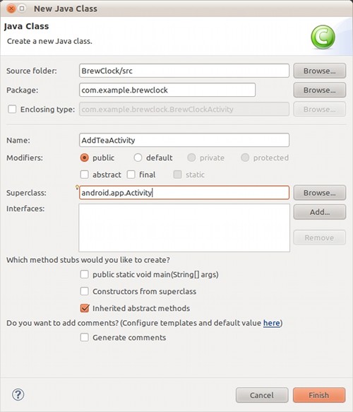 通过菜单File → New → Class.在BrewClock项目中创建一个TeaData的新类。确保TeaData扩展于android.database.sqlite.SQLiteOpenHelper 类,并选中“Constructors from superclass”复选框。