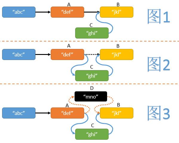3. 最后使节点A的next指针指向节点C。(见图2)